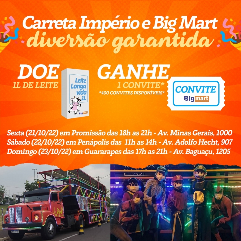 Participando da promoção da Carreta Império e Big Mart, você estará ajudando muitas pessoas, incluindo os idosos do nosso Lar. Por isso não fique de fora, junte-se nessa diversão!